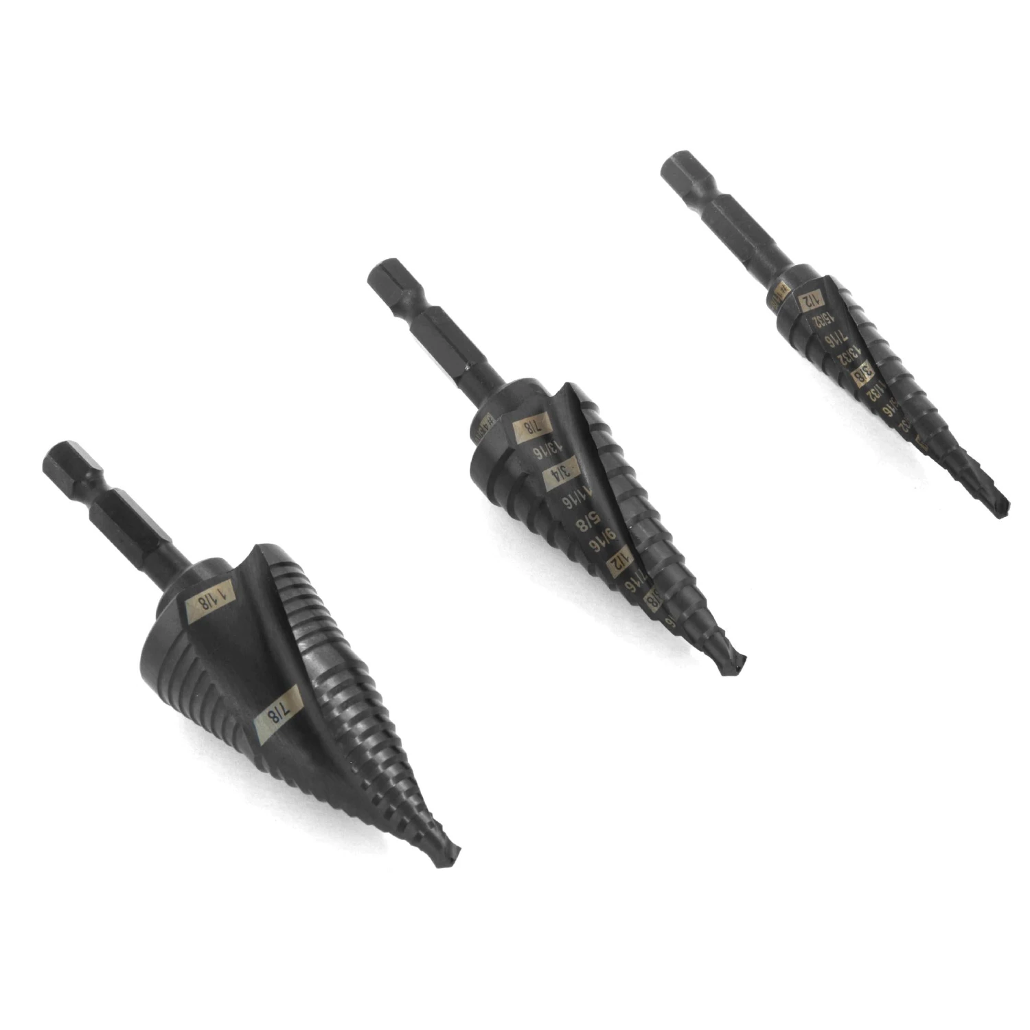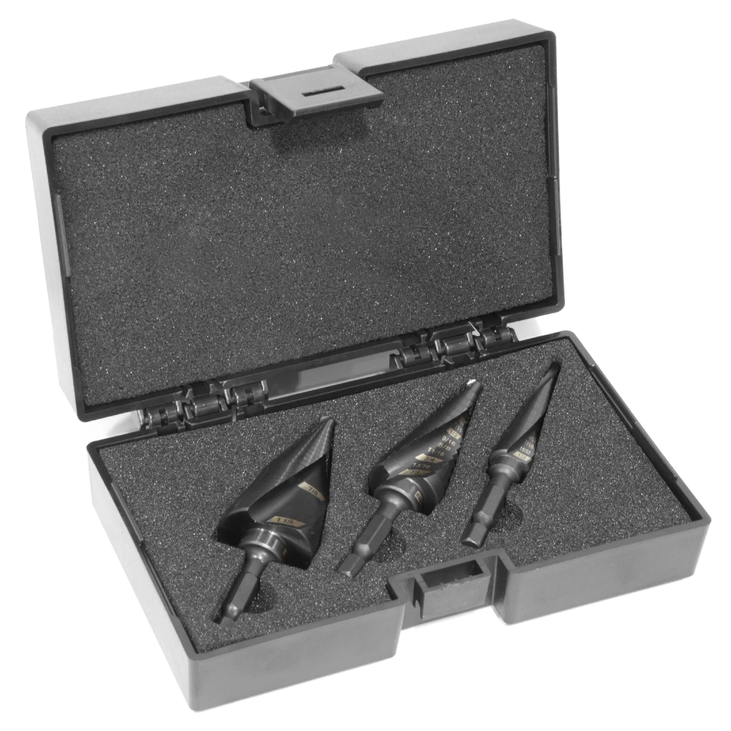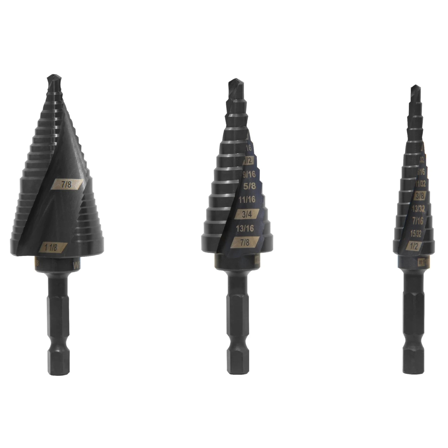 - Includes a #1 drill bit with 13 steps ranging from 1/8 to 1/2 inch in diameter, a #4 drill bit with 12 steps ranging from 3/16 to 7/8 inches, and one #9 drill bit with 20 steps ranging from 3/16 to 1-1/8 inches