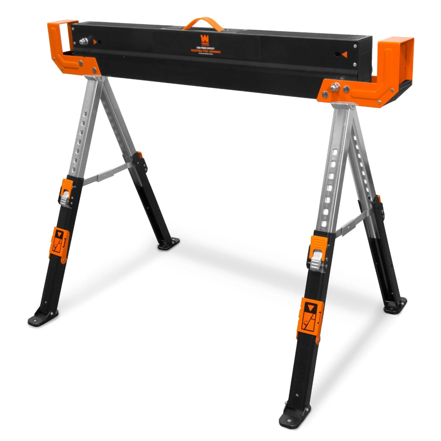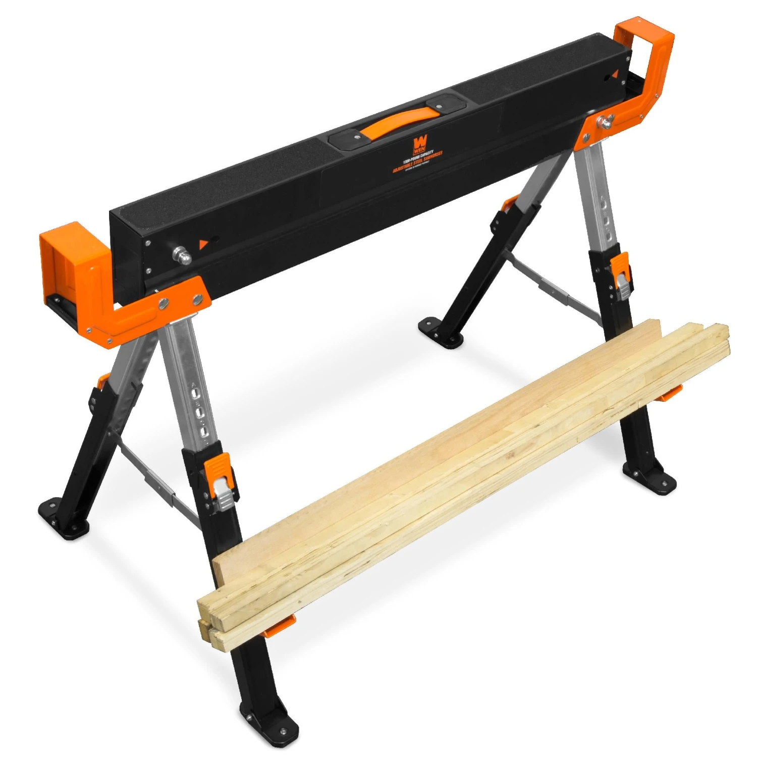 Remember when you had sturdy and reliable support for your project? The WEN 1300-Pound Capacity Saw Horse keeps your workpiece elevated for easy and accurate cutting. Perfect for woodworkers, contractors, painters, and more. Adjust between nine different heights ranging from 24 to 32 inches. Our lightweight yet sturdy design weighs in at a mere 20.5 pounds. Combine that with the collapsible legs and the convenient carrying handle for easy transportation and storage between jobs. Platform dimensions measure in at 43 by 5.75 inches with 1.75 by 3.5 inch support slot. These slots perfectly fit standard 2x4s, allowing you to easily turn a set of WEN sawhorses into a reliable and portable job site table with two 2x4s and a piece of plywood. Material support pegs hold additional pieces of lumber while the pivoting feet adjust to a variety of terrain and surface types. And, because its a WEN product, your saw horse comes backed by a two-year warranty, a friendly customer help line, and a robust inventory of replacement parts, all to make sure you remember WEN.